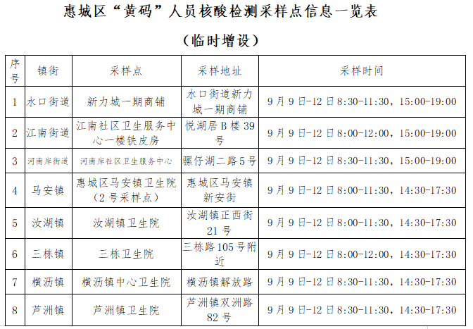 为方便“中秋”假期游客、旅客(含自驾车旅客)及来(返)惠人员核酸检测,惠阳区增设了部分核酸采样点,现将9月10日至9月12日采样点设置情况公告如下:
