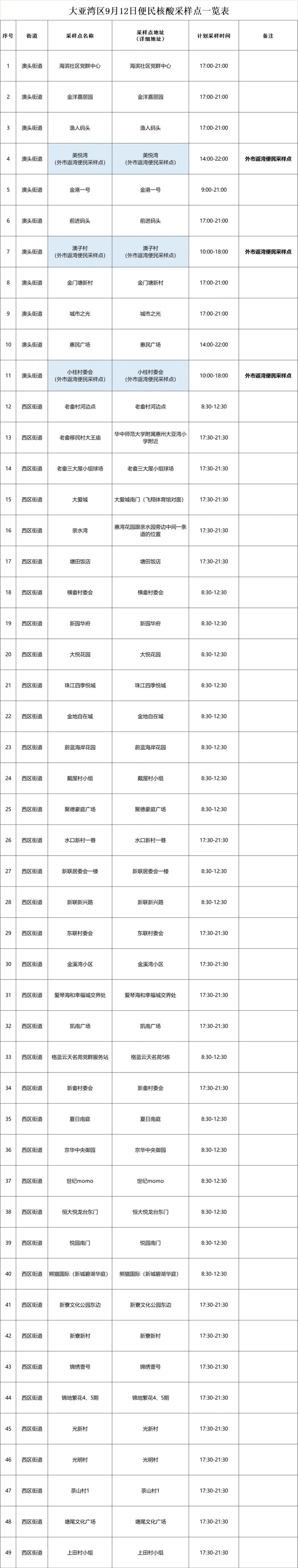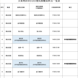 鉴于目前大亚湾区和周边地市疫情防控形势,为方便大亚湾区居民、外市返湾以及两地通勤人员核酸检测,主动发现疫情传播隐患,及时切断疫情传染途径,大亚湾区9月12日在三个街道办设置了91个便民核酸点。有关事项具体如下: