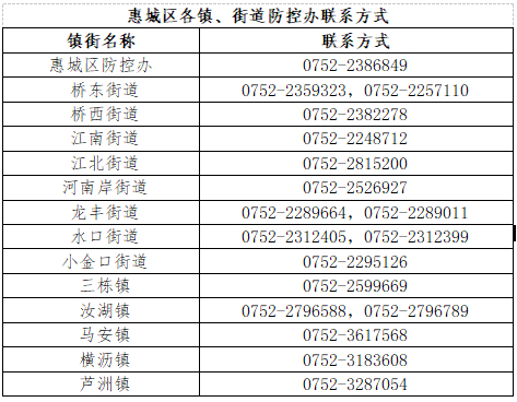 (二)近七天内有中、高风险区旅居史、与阳性感染者活动轨迹有交集的来(返)惠人员,或发现健康码变黄码、红码的人员,请务必第一时间主动向所在社区、工作单位或所住酒店报备,并配合做好医学隔离观察或健康监测等健康管理工作(各镇街防控办电话详见下表)。