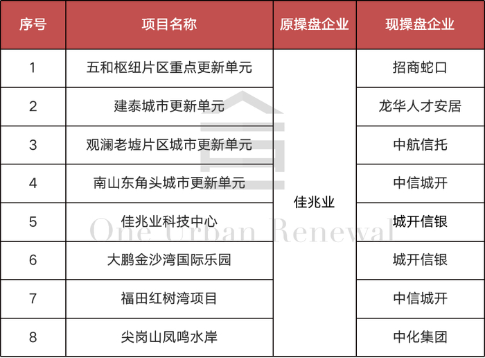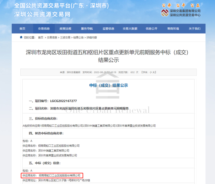 据了解,2021年7月,龙岗推出第二批平方公里级重点城市更新单元和重点利益统筹项目,其中包含了本项目;2021年7月5日,深圳公共资源交易中心首次发布坂田街道五和枢纽片区重点更新单元前期服务商招标公告;2021年7月20日,佳兆业集团(深圳)有限公司中标该项目前期服务商;2022年8月10日,深圳公共资源交易中心再次发布龙岗区坂田街道五和枢纽片区重点更新单元前期服务招标公告;2022年8月25日,招商蛇口中标龙岗区坂田街道五和枢纽片区重点更新单元前期服务商。