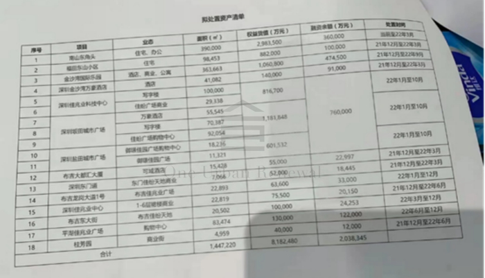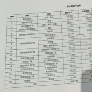 据网络流传的佳兆业拟着手处置资产清单,其中包括价值818亿的18个深圳项目,以及佳兆业权益258.39亿。18个项目中包括南山住宅项目、福田东山小区项目、大鹏金沙湾国际乐园、金沙湾万豪酒店、福田佳兆业深圳科技中心总部办公楼以及坂田佳兆业城市广场等。