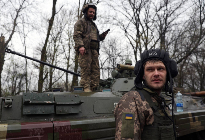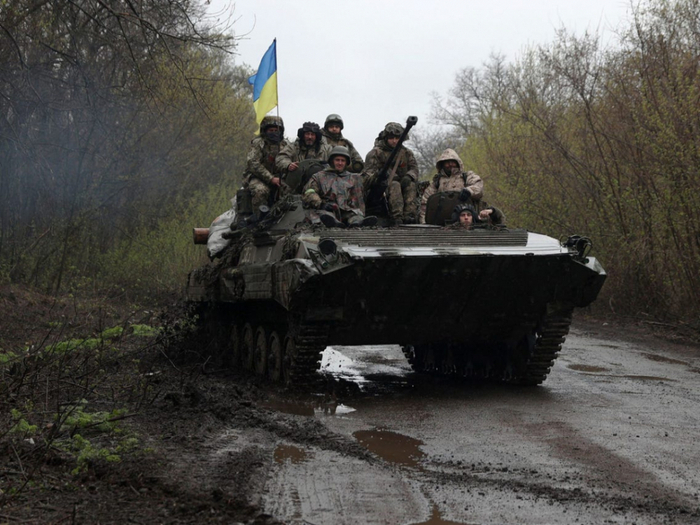 (乌克兰士兵在哈尔科夫附近的一辆装甲运兵车上)