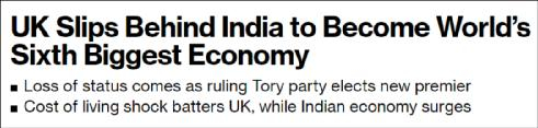 当地时间9月2日,彭博社刊发了一条明显带有挑事意味的报道——《英国落后印度成为世界第六大经济体》。
