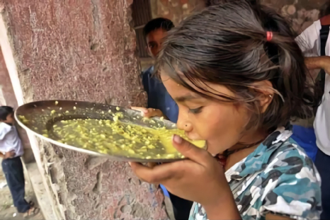 一名印度小学生在学校吃午餐小米粥(莫迪近年来把推广抗旱速熟的小米作为消灭营养不良的方法之一)