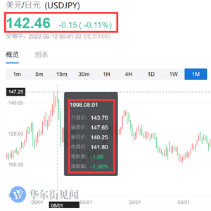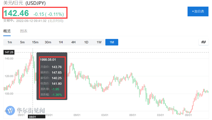 截止发稿,美元兑日元为142.46,周内最高达到144.99,一度逼近1998年金融危机最高点147.65。今年迄今为止日元已下跌超过20%。