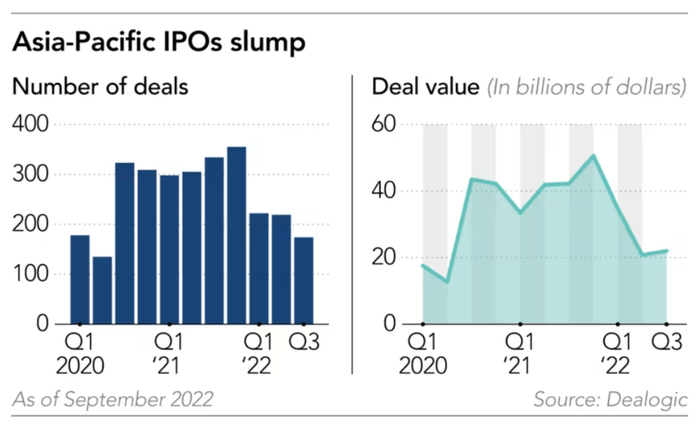 根据Dealogic的数据,今年第二和第三季度,亚太地区的IPO交易金额不到去年第四季度的一半。