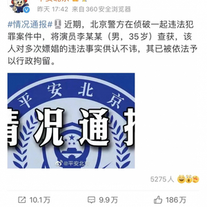 中国青年报消息,9月11日,北京警方通报,演员李某某因多次嫖娼被行拘。据央视报道,经记者通过权威渠道了解到,李某某为李易峰。