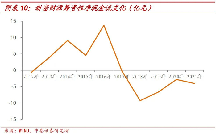 观察后续,新密财源于2017年9月13日成功发行5年期定向工具“17新密财源PPN005”,票面利率7.00%,高于同年7月发行的同期限定向工具利率50bp,之后于2018年和2020年分别发行了一期定向工具和一期私募债;后续未再出现偿还困难问题。不过2017年之后,新密财源筹资性净现金流持续为负。