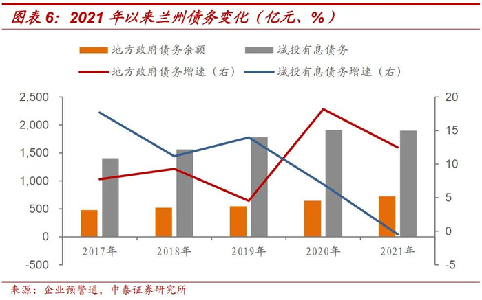 从债务增速看,兰州市城投有息债务于2017-2019年增速较快,同比分别为17.70%、11.17%和13.98%,地方政府债务集中于2020-2021年有较快的增速,同比分别为18.19%和12.51%。