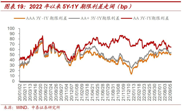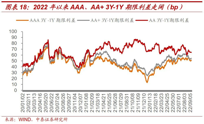 今年“资产荒”背景下,等级利差下行,期限利差走阔。截至2022年9月7日,等级利差较年初压缩约40.00bp,AAA、AA+3Y-1Y期限利差分别较年初走阔30.87bp和26.87bp,AA3Y-1Y期限利差变动不大;AAA、AA+和AA 5Y-1Y期限利差分别较年初走阔32.96bp、27.37bp和21.37bp。等级利差先行压缩、期限利差走阔可能还是与当前信用债以城投债为主的净融资结构有关,市场对城投债短期信用下沉有些许把握,而城投融资偏紧、地方财政压力等使得投资人不敢轻易拉长久期。我们认为,当下对强资质地区城投适当进行久期策略或比下沉策略更为合适。