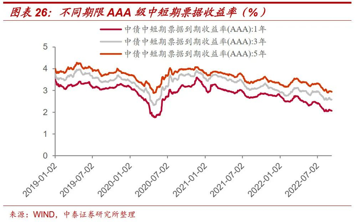 本周中短票据收益率均下行。具体来看,本周AAA评级1年期、3年期和5年期中短票据分别收于2.07%、2.58%、2.94%,较上周分别下行2.04bp、1.22bp和3.14bp。