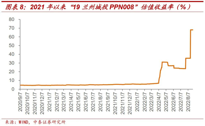 2022年3月21日,兰州城投担保的非标“生命资产-兰州高原夏菜采购中心债权投资计划”利息兑付出现逾期,逾期利息合计1,493.25万元[4]。兰州城投和兰州建投存续债券估值收益率自此开始上行。