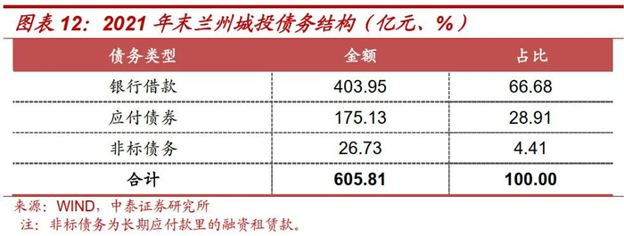 由于年报数据明细披露较为全面,我们以2021年有息债务数据观察兰州城投债务结构。2021年末,兰州城投银行借款、应付债券和非标占比分别为66.68%、28.91%和4.41%。综合来看,短时间内兰州城投债务偿还或主要依赖政府回款、银行借款接续。