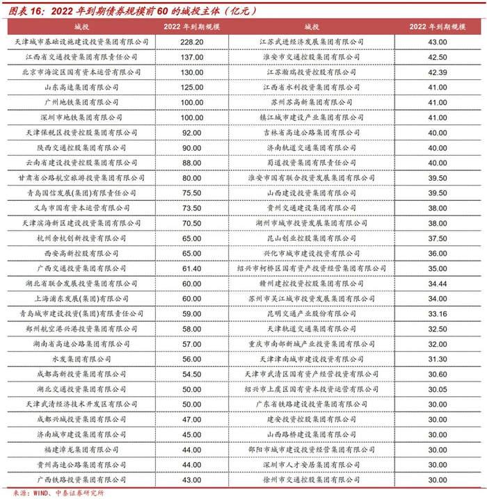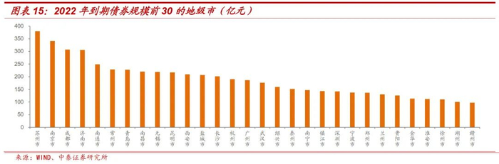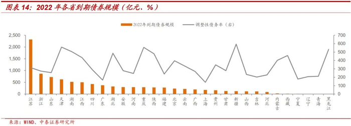 当下城投大面积违约不太可能,但在经济下行、融资端审核并未明显放松的情况下,零星地区出现流动性紧张、偿还困难预计是之后较为普遍的现象。截至2022年9月7日,今年债券到期规模较大的几大省份主要集中于江苏、浙江、山东、天津、湖南、江西等,这些省份本身存续债规模也较大。总体上,需对财政经济市里较弱、债务负担较重的省(如天津、云南、广西、贵州等)及部分地级市保持关注。
