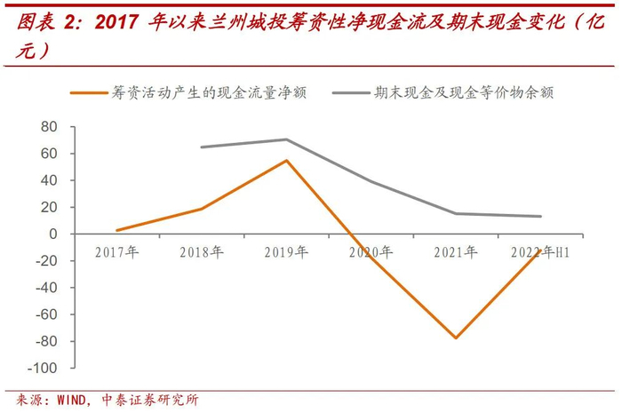 截至2022年6月末,兰州城投短期有息债务合计99.08亿元,总有息债务合计528.54亿元,期末现金及现金等价物13.11亿元,2020-2021年,兰州城投筹资性净现金流和投资性净现金流持续为负,作为兰州市市政基础设施的主要投建主体,其经营性现金流主要依赖政府回款。