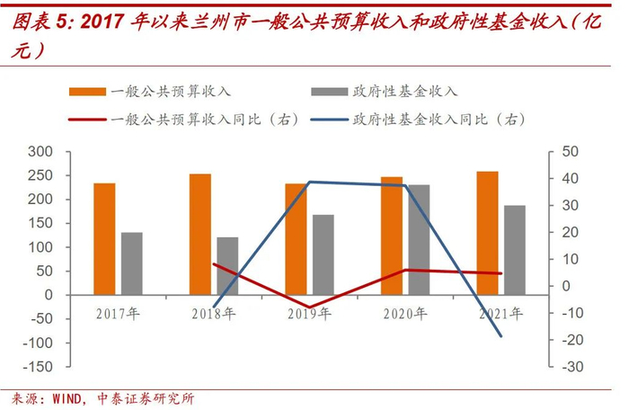 2021年,兰州市一般公共预算收入258.73亿元,在27个省会城市(不含四个直辖市)中排名第22,财政自给率55.61%,政府性基金收入187.57亿元,排名第22,调整性债务率581.55%,排名第2[2]。回看2017年以来兰州市财政收入走势,一般公共预算收入整体保持稳定,2019-2020 年政府性基金收入保持较快增速,但2021年受地产下行影响,增速随即转负。