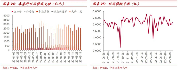 本周信用债市场成交活跃度略有回升。本周信用债周度换手率为2.15%,较上周回升0.11个百分点。分券种看,企业债、公司债、中期票据、短期融资券和定向工具成交量分别为236.91亿元、367.71亿元、2,589.77亿元、1,858.51亿元和614.22亿元,企业债、公司债、短期融资券成交量较上周有所回升,中期票据、定向工具成交量较上周回落。