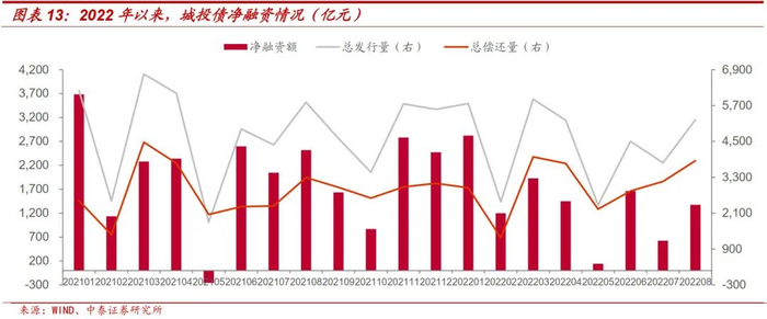 而从今年城投净融资情况看,城投审核端并未明显放松,城投融资环境仍偏紧。2022年1-8月,城投债发行规模35,266.71亿元,同比下降8.40%;净融资规模11,197.46亿元,同比下降31.49%。