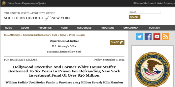 美国检察官达Damian Williams这样描述萨德尔:“表面上,他是光鲜亮丽的好莱坞大亨;背地里,他却进行着厚颜无耻的勾当。利用假公司、假文件、甚至假身份,萨德尔极力掩盖着自己的罪行。”