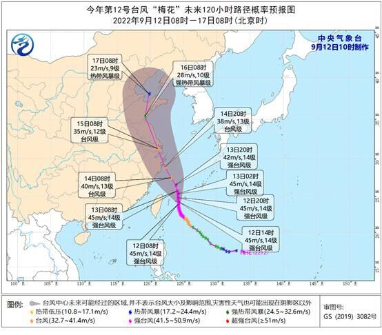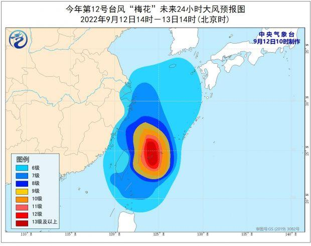 今年第12号台风“梅花”(台风级)12日14时中心距离浙江省舟山市东南方向约610公里,中心附近最大风力13级,中心气压960百帕。预计,“梅花”将以每小时5~10公里的速度向西北方向移动,逐渐向浙江东北部沿海靠近,于14日夜间至15日白天登陆或擦过上述沿海地区,并减弱北上,可能于16日进入山东。