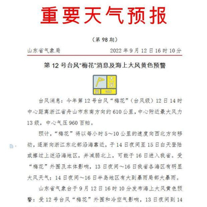 齐鲁网·闪电新闻9月12日讯山东省气象台今天16时10分发布今年第12号台风“梅花”消息及海上大风黄色预警。