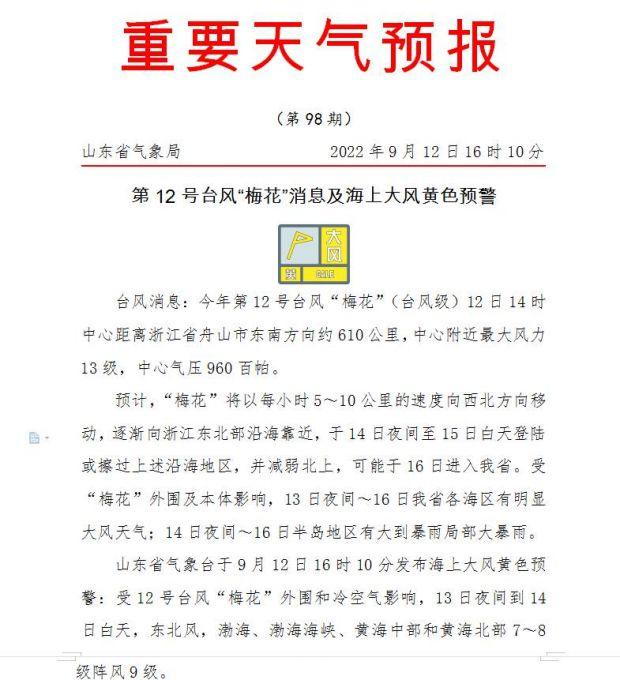山东省气象台于9月12日16时10分发布海上大风黄色预警:受12号台风“梅花”外围和冷空气影响,13日夜间到14日白天,东北风,渤海、渤海海峡、黄海中部和黄海北部7~8级阵风9级。