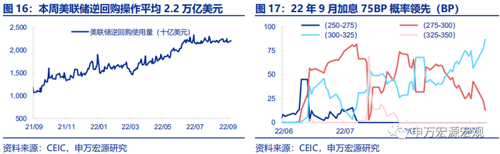 货币操作:美联储加息75BP概率推升至87%。本周美联储逆回购操作平均2.2万亿美元。美联储官员近期“鹰声四起”推升市场加息预期,目前市场预期9月加息75BP的概率最大(87%)。