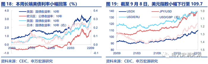 汇率利率黄金:本周美元指数震荡下行,金价小幅回升。受欧央行周四激进加息75BP推升欧元汇率的影响,美元指数小幅下行。本周长端美债利率小幅回落(截至9月8日为3.3%),黄金价格先下跌后小幅回升,较上周小幅上涨0.5%。