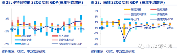 沙特、南非二季度实际GDP环比负增长。沙特阿拉伯Q2实际GDP三年平均增速小幅上升至2.0%,环比-2.1%,同比12.2%,主要受益于净出口的激增和高油价的影响。南非22Q2实际GDP不及预期,三年平均增速下滑至-0.1%,环比-0.7%,主要受到政府投资和消费以及净出口的拖累。