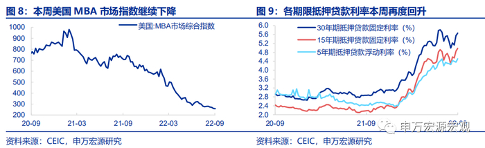 地产:本周美国MBA市场指数继续下行,已连续四周放缓。各期限抵押利率继上周后再度回升,进一步抑制房产市场需求。