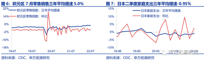 需求:欧元区7月零售较上月改善。7月欧元区零售指数环比0.6%,三年平均增速5.0%,较上月均有提升。日本二季度家庭支出环比2.6%,三年平均增速-1.0%。