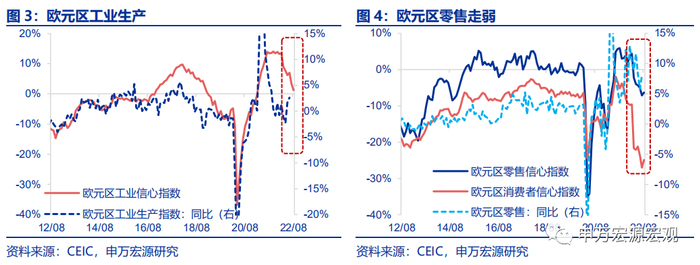 2)疫情以来,欧元区国家财政刺激的幅度本身是小于美国的,加上欧央行已经关注到,更大的能源价格涨幅也正在损害欧元区居民收入的真实购买力,实际上欧元区居民的消费需求较美国是更加温和的,最新公布的6-7月欧元区零售销售同比也均为负值并且低于市场预期。