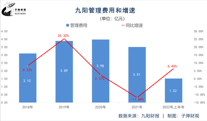 再看成本。九阳的管理费用正上涨。据九阳此前发布的财报显示,2022年上半年该公司的管理费用为1.52亿元,较上年同期的1.43亿元提升6.45%。