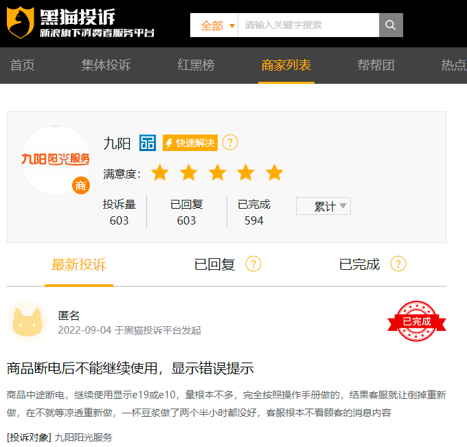 其次,九阳也面临口碑信誉下滑的尴尬境地。‘子弹财观’注意到,在黑猫投诉平台上,涉及九阳的投诉合计高达603条,而网友们对九阳的投诉主要为产品质量差、售后服务差、虚假宣传、不发货与退款难等。