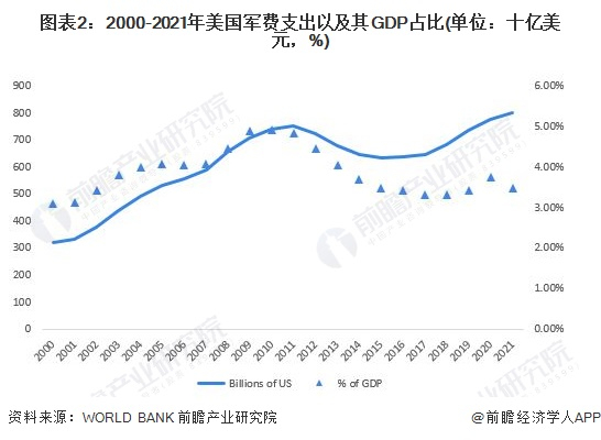 2000-2021年,美国的军费支出呈不断上升趋势,到2021年,美国军费支出达到8010亿美元,位居全球第一,美国军费支出主要用于对下一代军事技术的研究。美国军费支出占GDP比重维持在3%-5%之间,2010年支出占比最高,达到4.92%,近年来有所下降。在军费支出不断上升的情况下,对军工电子的研发支持也不断提高。