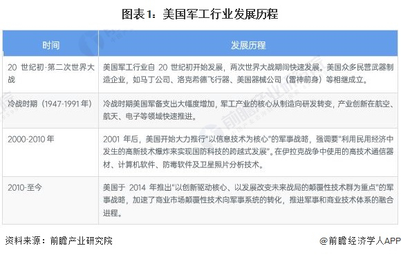 美国军工电子行业自20世纪初开始发展,于冷战时期快速发展,产业创新在航空、航天、电子等领域快速推进。2010年至今,美国军工行业的发展战略主要为研发颠覆性技术,促进了军工电子行业的技术研发。