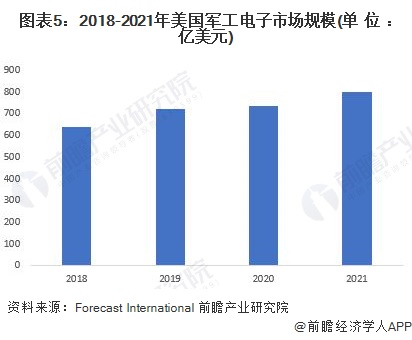 近年来受国际事件和政治的推动,美国军工电子市场持续增长。根据Forecast International公司数据显示,2018-2028年期间,美国军工电子市场规模持续增长,2018年美国军工电子市场规模已经达到638亿美元,2019年约为723亿美元,约占美国军费开支的10%,结合美国军费开支初步统计,2021年美国军工电子市场规模约801亿美元。