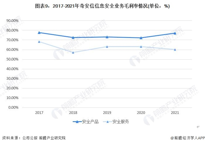 从盈利情况来看,2017-2021年,奇安信安全产品和安全服务的毛利率均在50%以上。尤其是安全产品,保持在70%以上,2021年为77.02%。2021年奇安信安全服务的毛利率为60.13%。整体来看,奇安信毛利率水平较高,盈利能力较强。