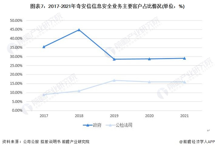奇安信在信息安全B端市场占有领导地位,与政府机构合作历史悠久,现作为“国家队”,相关合作更加密切。具体来看,2017-2021年,政府机构始终是奇安信的主要客户,政府客户的业务收入占比始终保持在25%以上,尤其是在2018年,政府客户的订单规模占比高达44.88%。另外,公检法司的业务收入占比居于第二位。