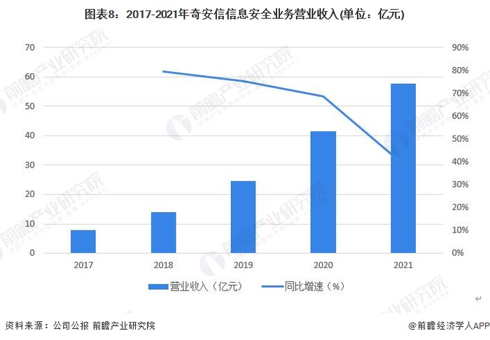 2017-2021年,奇安信有关信息安全业务营业收入呈上升趋势。2021年,奇安信信息安全业务收入为57.81亿元,同比增长39.17%。营业收入同比增速较往年有所下降,但仍处于较高的业务扩张水平。
