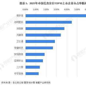 根据2021年各企业的安全业务收入占全国信息安全市场规模比重计算得出,2021年我国信息安全行业上市企业奇安信(688561.SH)和启明星辰(002439.SZ)的市占率稳居前二。