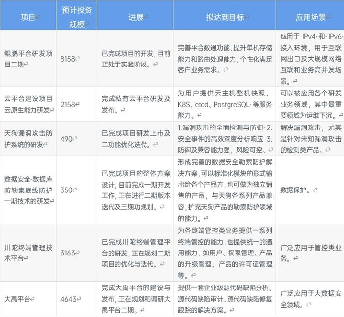 依据奇安信2021年报发布的在研项目来看,共计18个在研项目涵盖了平台搭建、新产品研发等各方面。