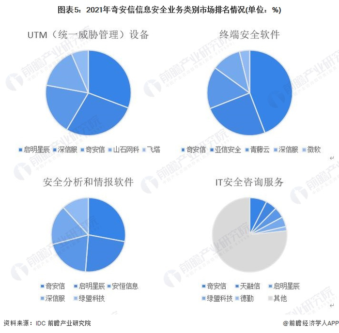依据IDC数据,奇安信2021年荣获多项细分领域的第一,如终端安全软件、安全分析和情报软件以及IT安全咨询服务三大类别;另外,在UTM(统一威胁管理)设备市场,奇安信位居第三。