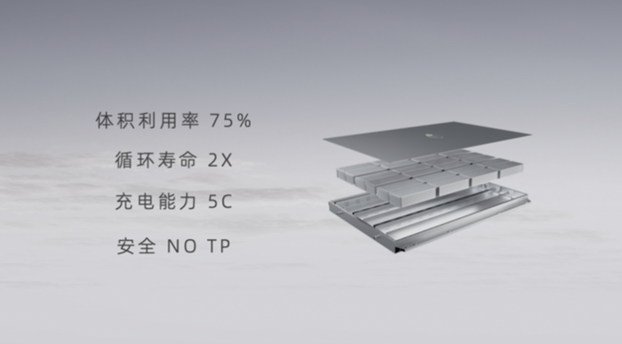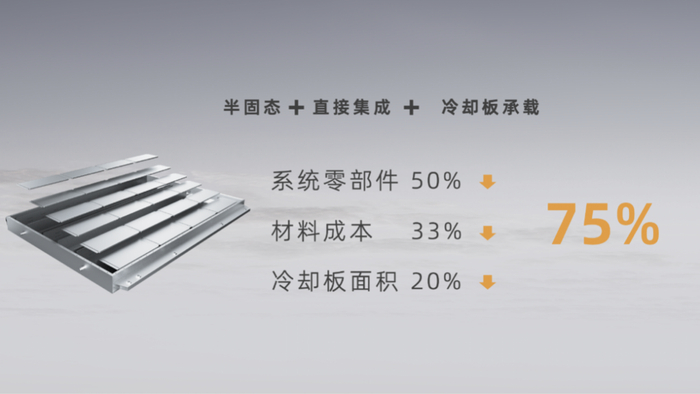 在大软包电芯的基础上,SPS大软包电池系统得以采用高效液冷板与底盘的一体化设计,半固态大软包电芯直接集成于系统底盘,使系统零部件减少50%,材料成本降低33%,体积利用率增加30%至75%。