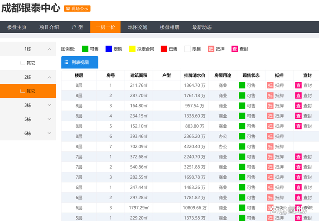查询发现,该地址所匹配项目为“银泰中心”。2022年9月13日,氢地产新媒体通过透明房产网查到,目前,银泰中心诸多“商业”处于抵押及查封状态。以2栋6层3号商业为例,该商业面积约1797平米,挂牌价约1.08亿元,按此计算,折合每平米6万元。