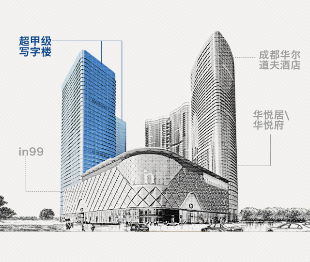 据悉,成都银泰中心位于金融城核心地带,由5栋超高层塔楼及超大型高端商业裙楼组成,主塔楼是目前成都中轴线上建筑高度最高的楼宇。成都银泰中心集成都华尔道夫酒店、商务豪宅华悦府、阔景公寓华悦居、购物中心in99、超甲写字楼于一体,总建筑面积约72万平米,是成都高端城市综合体,也是成都地标之一。