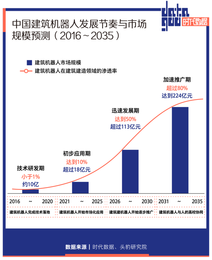 据头豹研究院研究显示,现阶段,建筑机器人基本完成技术落地,正逐步在建筑建造工程中得到应用。首批建造机器人企业稳定向好发展;预计到2025年,在建筑建造领域中的渗透率达到10%,市场规模超过18亿元。