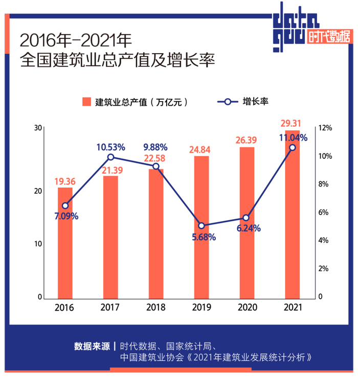 另一方面,我国建筑业仍维持高速发展,2021年,建筑业总产值达到29.31万亿元,同比增长11.04%。