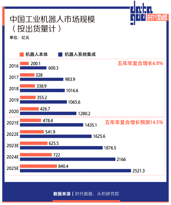 与此同时,我国工业机器人市场规模实现快速增长,据头豹研究院数据显示,按出货量计,2020年我国工业机器人市场规模达到1760.9亿元,五年年复合增长率6.8%。预计到2025年,工业机器人市场规模将达3361.7亿元,未来五年年复合增长率将达14.5%。