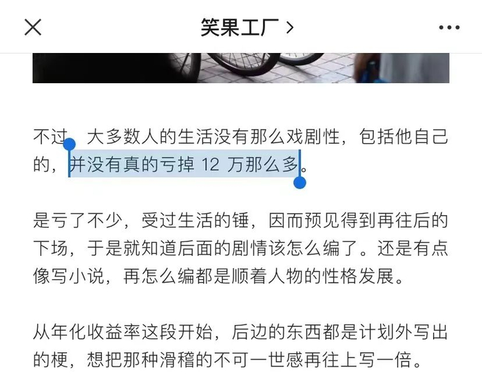 不过,在笑果工厂公众号最新推送的内容中,House讲述了自己对于上述内容的创作过程,并直接表示,演出有喜剧加工的成分,“并没有真的亏掉那么多”“从年化收益率这段开始,后边的东西都是计划外写出的梗。”
